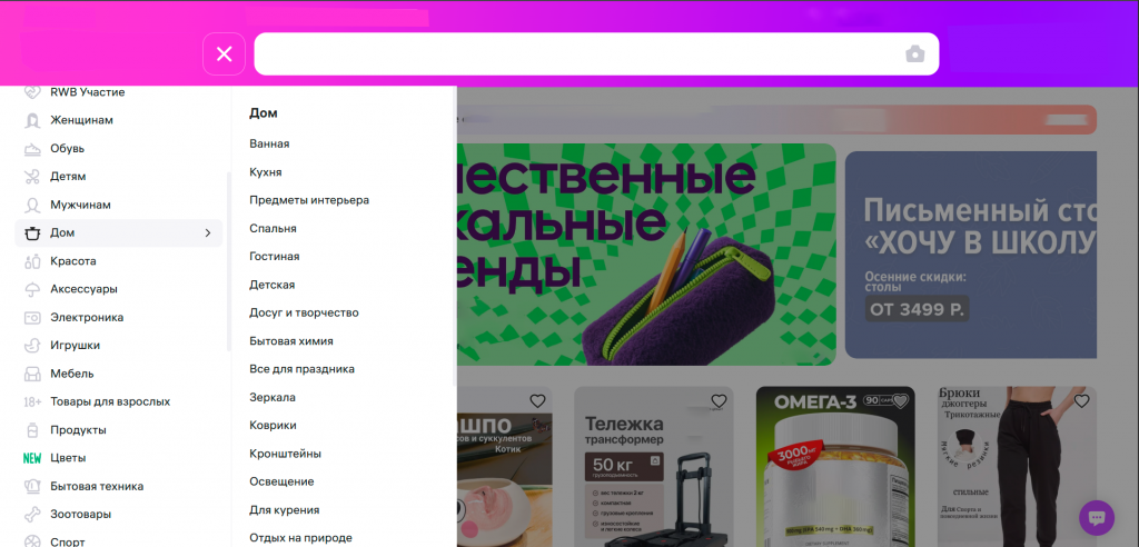 Платформа с множеством категорий товаров. Хорошо демонстрирует масштабность решений: фильтры, поиск, личный кабинет, корзина, разные способы оплаты и доставки.